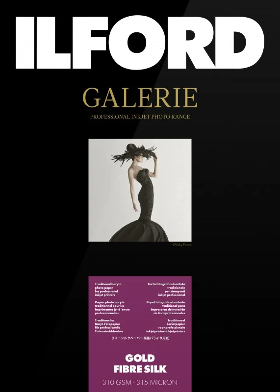 ILFORD GALERIE GOLD Fibre Silk to ekskluzywny bezkwasowy papier barytowy do fotograficznych drukarek atramentowych wykorzystujących w procesie druku tusze pigmentowe. Wysoka gramatura papieru 310 g/m² i wykorzystanie dodatkowej tylnej warstwy przeciwdziałającej zwijaniu się daje poczucie pracy z materiałem najwyższej jakości.