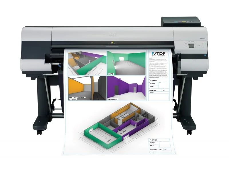 iPF 830 z podstawą i kolorowa kopiarka laserowa Canon MF628Cw