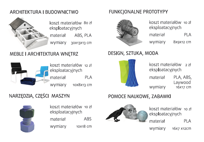 - filamenty: ABS, PLA, Laywood i inne materiały