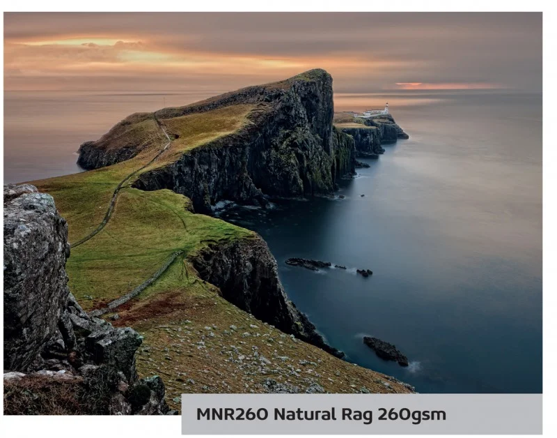 Papier MNR260 Natural Rag jest w 100% bawełniany, charakteryzuje się miękką, aksamitną i naturalnie białą powierzchnią. Idealny do zastosowań fotograficznych i wysokiej jakości zdjęć. Museum Natural Rag został zaprojektowany specjalnie dla użytkowników, których zdjęcia i drobne reprodukcje wymagają powierzchni o wysokiej jakości. Dzięki specjalnej powłoce atramentowej oraz atramentom pigmentowym i barwnikowym można osiągnąć wyjątkowo intensywne barwy, najwyższy D-max i dokładną reprodukcję. Stabilny i jednolity papier o bezpyłowej powierzchni.